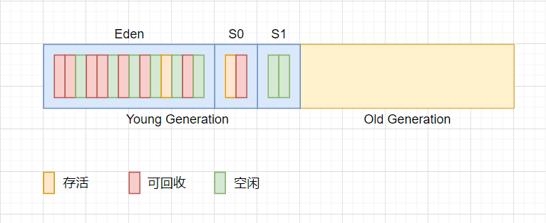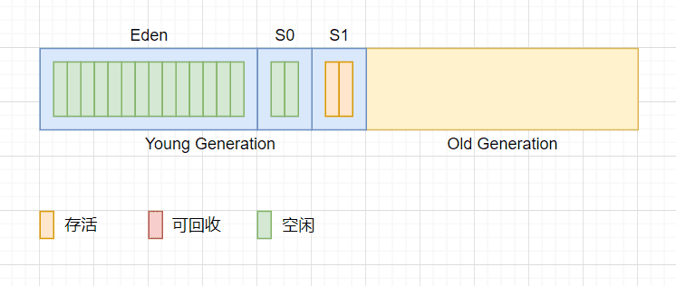 此时如果需要程序要求 JVM 为其分配一个 2 单位的连续空间,可以看到 Eden 只剩下一个单位的连续空间了,这时候为了能分配成功,JVM 会执行一次 Young GC(为了避免产生歧义这里都使用按区域划分的 GC 分类),Eden 的存活对象会移动到 S0,同时可回收的对象的空间也会被回收,状态如下图所示: