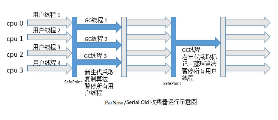 - Serial Old,用于老生代,采用标记-整理标记整理算法,回收时采用单线程的方式。进行垃圾收集的时候需要暂停其他线程(STW)。